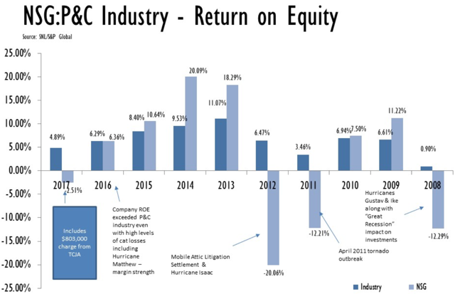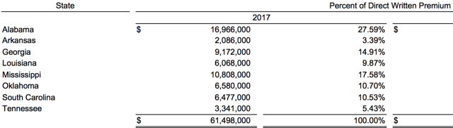 The company is slowly diversifying away from the Gulf region as shown with the premium volume in Oklahoma, Tennessee and Georgia. This trend will continue, although at a somewhat slow pace as the competition to write business in those states may become unfavorable and writing business for unfavorable policies in order to fulfill a diversification target could be extremely costly. It is important to note that a home owner's insurance policies for the customer in Alabama would be more expensive than a home owner's insurance, for example, in Nebraska as the probability of a claim in Nebraska is lower as there obviously are no hurricanes in the Midwest to cause home damage. The average home owner's annual rate in Nebraska is $1,583 compared to Alabama where the rate is $2,134. So writing home owner's insurance for claim-prone states like Alabama, Mississippi and Louisiana isn't necessarily riskier than writing business for a state like Nebraska. The company also has a small life insurance segment that makes up around 10% of total policies and gives NSEC an added leg to hold up the chair. I would note that last year the company had a difficult year in underwriting, as did many insurers as a result of the unusually high amount of claims due to the extremely active storm season. However I am extremely confident that the unusually bad 2017 storm season that gave NSEC a net loss is unlikely to become a consistent pattern. Another added cushion that NSEC has [thus making it a conservative investment] is the reinsurance policy they have, which covers up to 2 events in each calendar year that exceed $4 million in claims. So NSEC would still bear the liability of the first $4 million, yet the reinsurer would bear any added liability [over $4 million].